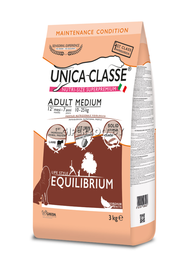 Сухой корм Unica Classe Adult Medium Equilibrium для собак средних пород (ягненок), 3 кг - это полнорационный сухой корм для взрослых собак средних пород для поддержания баланса в ЖКТ.