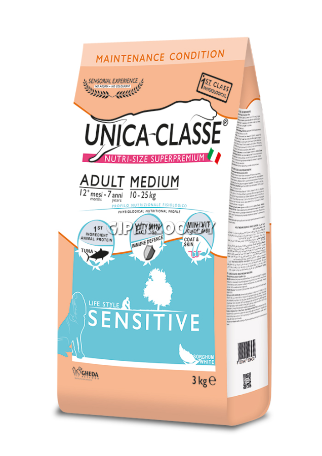 Сухой корм Unica Classe Adult Medium Sensitive для собак средних пород (тунец), 12 кг - это полнорационный сухой корм для взрослых собак средних пород для поддержания красоты шерсти и здоровья кожи.