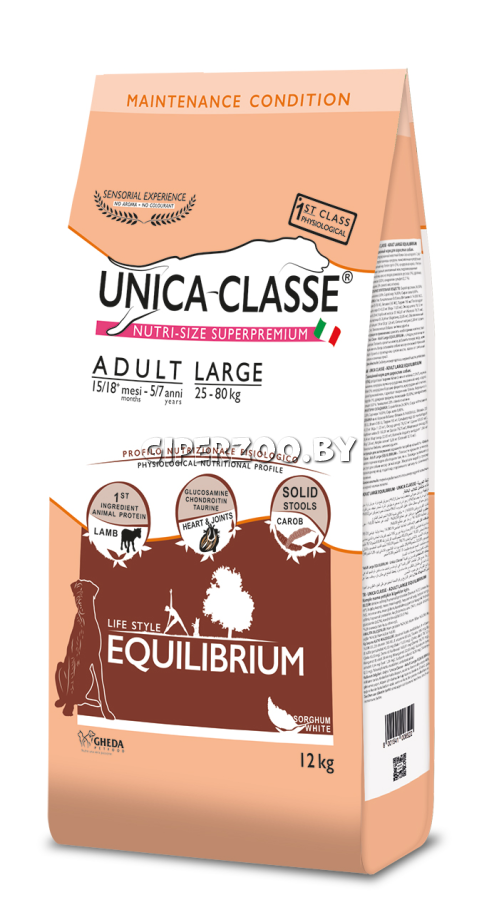Сухой корм для взрослых собак крупных пород Unica Classe Adult Large Equilibrium (Ягненок), 12 кг - это полнорационный сухой корм для взрослых собак крупных пород для поддержания баланса в ЖКТ.