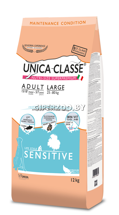 Unica Classe Adult Large Sensitive (тунец), 12 кг - это полнорационный сухой корм для взрослых собак крупных пород для поддержания красоты шерсти и здоровья кожи.