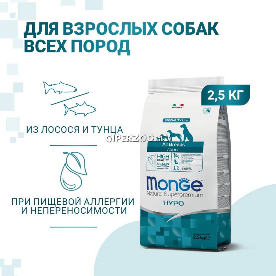 Сухой корм для собак MONGE SPECIALITY LINE ALL BREEDS ADULT HYPO SALMONE & TUNA (лосось и тунец), 2,5 кг - это полноценный сбалансированный рацион с лососем и тунцом для взрослых собак всех пород, которые обладают повышенной чувствительностью к компонентам корма. Разработан на основе мяса рыб семейства лососевых, богат омега-3 и омега-6 жирными кислотами, которые позволяют предупредить воспалительные процессы и сохранить здоровье кожи и блеск шерсти вашего питомца.