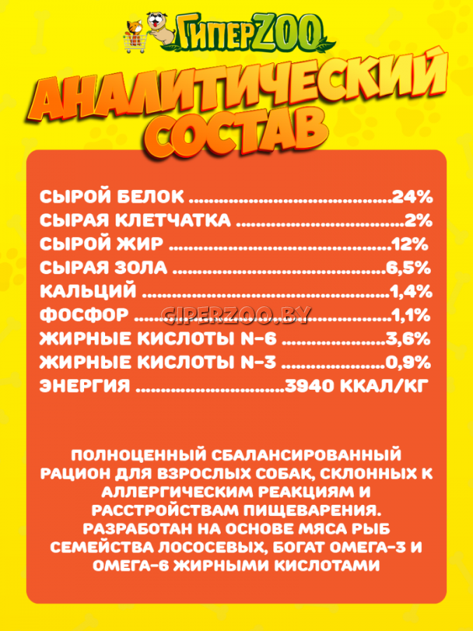 ПИТАТЕЛЬНАЯ ЦЕННОСТЬ: сырой белок 24,00%, сырые масла и жиры 12,00%, сырая клетчатка 2,00%, сырая зола 6,50%, кальций 1,40%, фосфор 1,10%, омега-6 жирные кислоты 3,60%, омега-3 жирные кислоты 0,90%.