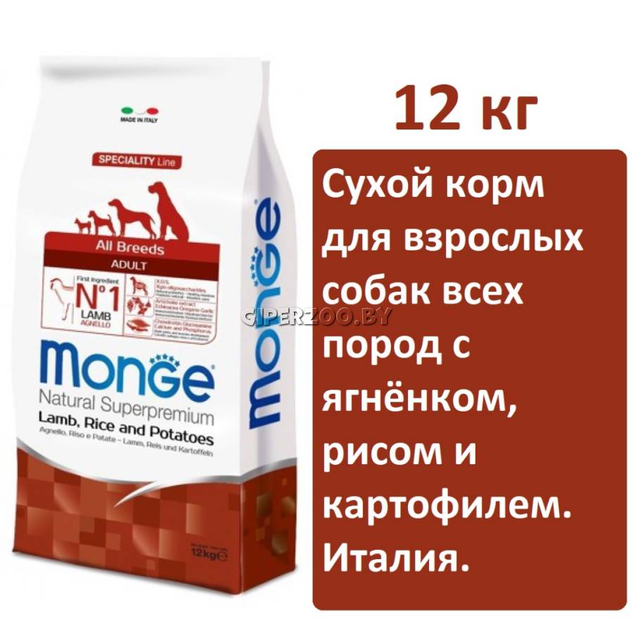 Monge Adult All Breeds dog (ягненок и рис), 12 кг - это полноценный сбалансированный рацион для взрослых собак всех пород. Оптимален для собак, склонных к аллергическим воспалительным реакциям.
