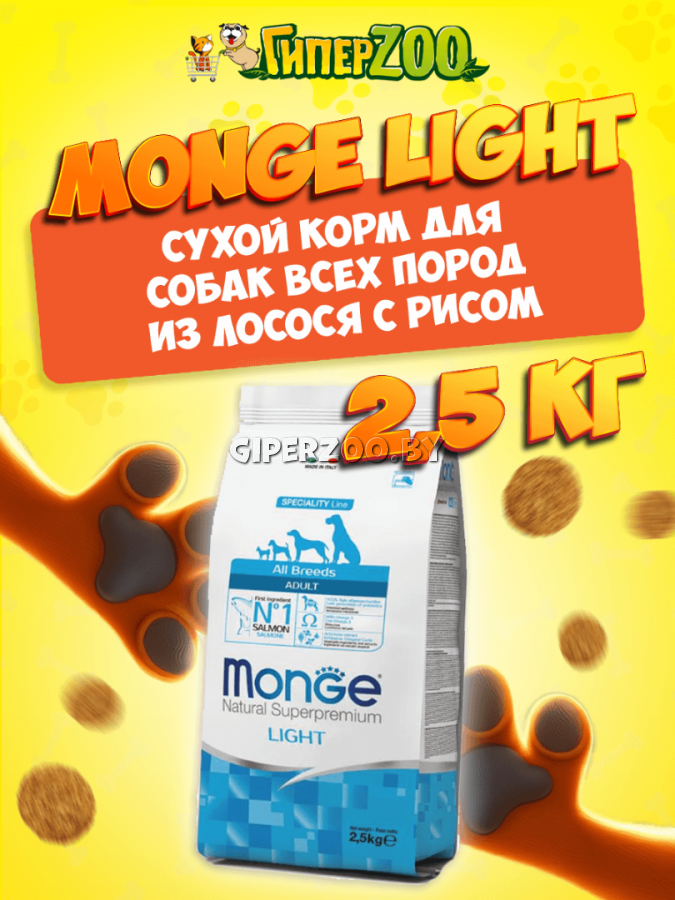 Monge Light Adult All Breeds dog (лосось и рис), 2,5 кг - полноценный сбалансированный рацион для взрослых собак всех пород с особыми потребностями, склонных к набору избыточного веса. Корм разработан специально для снижения и поддержания идеального веса собаки.