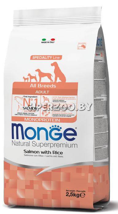 MONGE SPECIALITY LINE ALL BREEDS ADULT SALMONE AND RICE - это полноценный сбалансированный рацион для взрослых собак всех пород с особыми потребностями. Богат омега-3 и омега-6 жирными кислотами, которые позволяют предупредить воспалительные процессы и сохранить здоровье кожи и блеск шерсти вашего питомца.