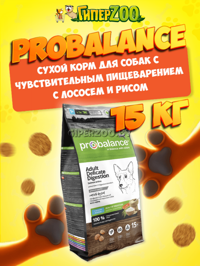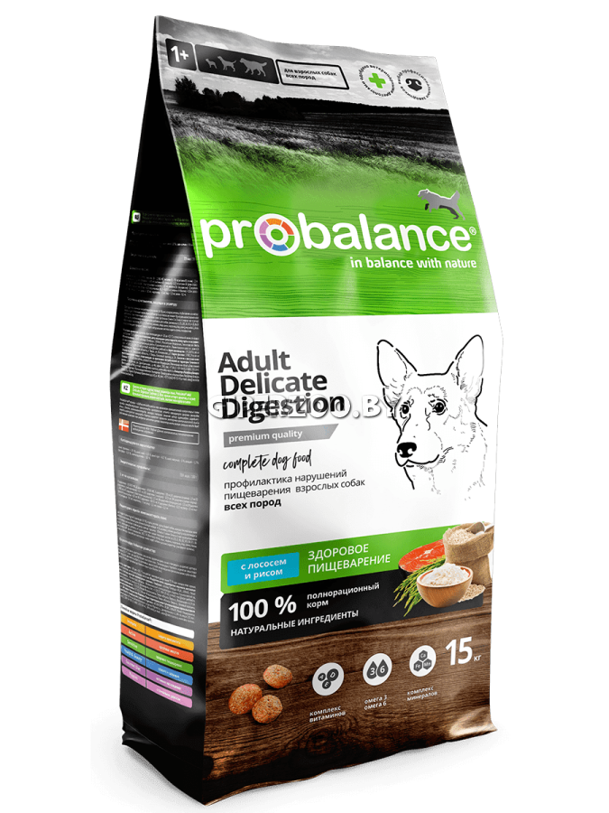 ProBalance Delicate Digestion (лосось, рис), 15 кг - полнорационный сбалансированный сухой корм премиум класса для собак всех пород с лососем и рисом. Предназначен для ежедневного кормления взрослых собак всех пород. Подходит для животных с чувствительным пищеварением. Семена льна и лосось являются источником, незаменимых для здоровья животного, Омега-3 и Омега-6 жирных кислот. Высокое содержание калия обуславливает пользу риса для сердечно-сосудистой системы, он укрепляет сердечную мышцу, способствует улучшению работы сердца. Рис обладает мягким обволакивающим действием, которое оказывает благоприятное воздействие на слизистую оболочку желудка и кишечника. Состав корма подобран таким образом, что он полностью удовлетворяет потребности собак в питательных веществах, витаминах и минералах.
