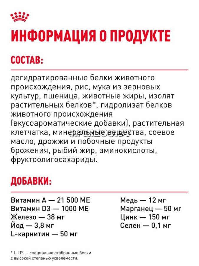 рис, дегидратированные белки животного происхождения (птица), мука из зерновых культур, изолят растительных белков*, пшеница, животные жиры, гидролизат белков животного происхождения (вкусоароматические добавки), растительная клетчатка, минеральные вещества, рыбий жир, соевое масло, дрожжи и побочные продукты брожения, фруктоолигосахариды.