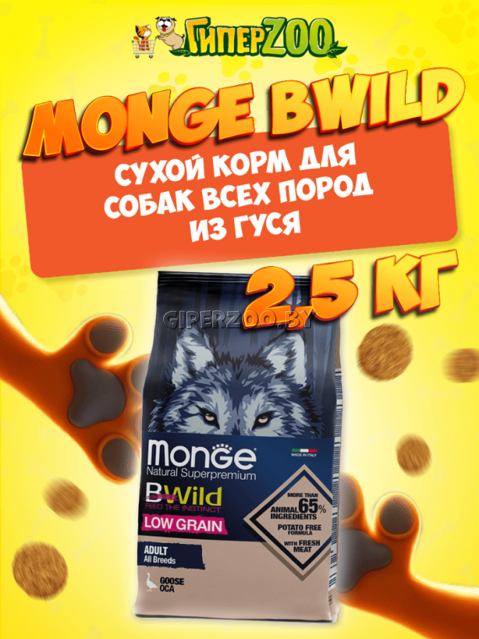 Monge BWild Low Grain Adult All Breeds (гусь), 2,5 кг - это сбалансированный низкозерновой корм для собак всех пород с мясом гуся.это полноценный и сбалансированный корм для взрослых собак.