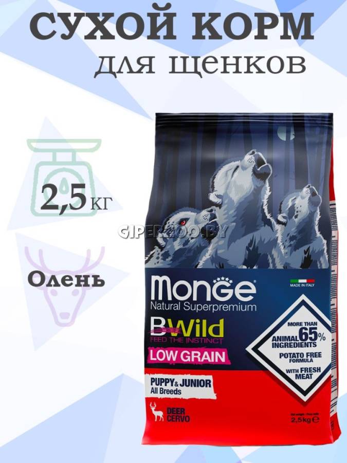 Monge BWild Low Grain Puppy All Breeds (оленина), 2,5 кг - это полноценный и сбалансированный корм для щенков. Высокое содержание животного белка в оленине и яйцах гарантирует сбалансированную диету для роста ваших щенков в соответствии с их естественным инстинктом.