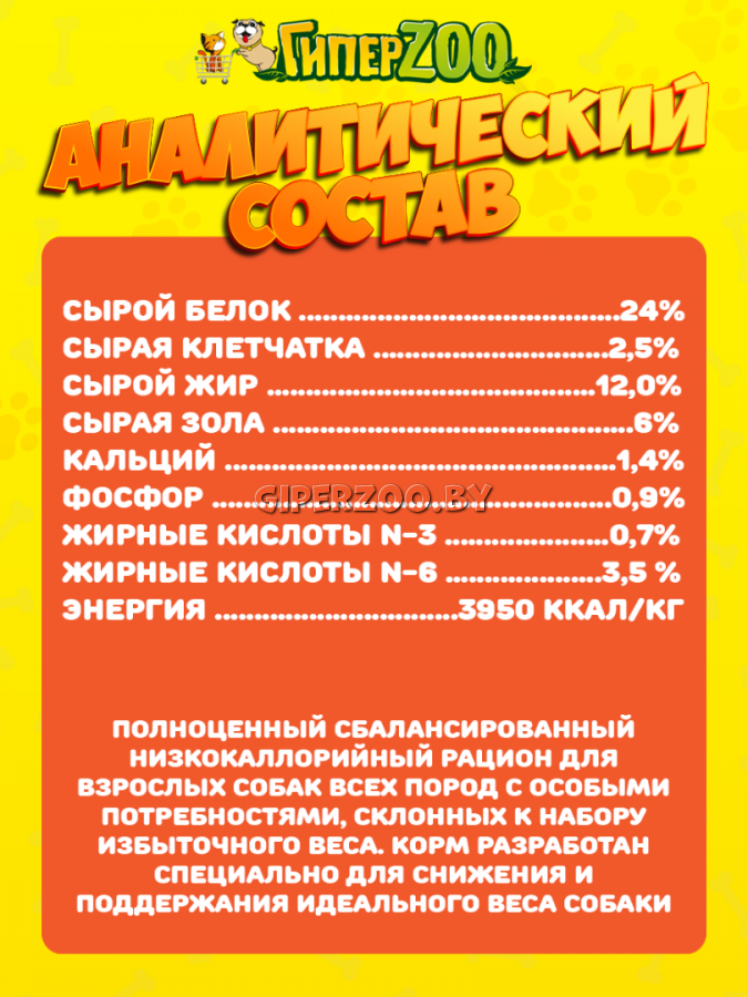 Гарантированный анализ: сырой белок: 24%, сырая клетчатка: 2,5%, сырой жир: 12,0%, сырая зола: 6%, кальций: 1,4%, фосфор: 0,9%, жирные кислоты n-3: 0,7%, жирные кислоты n-6: 3,5 %.