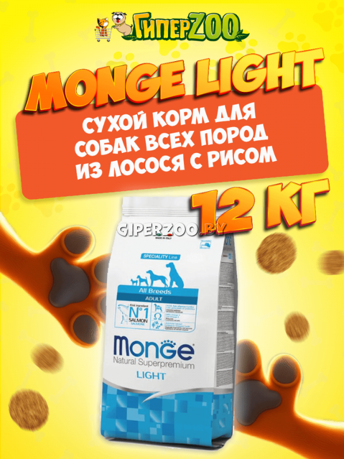 Monge Light Adult All Breeds dog (лосось и рис), 12 кг - полноценный сбалансированный рацион для взрослых собак всех пород с особыми потребностями, склонных к набору избыточного веса. Корм разработан специально для снижения и поддержания идеального веса собаки.