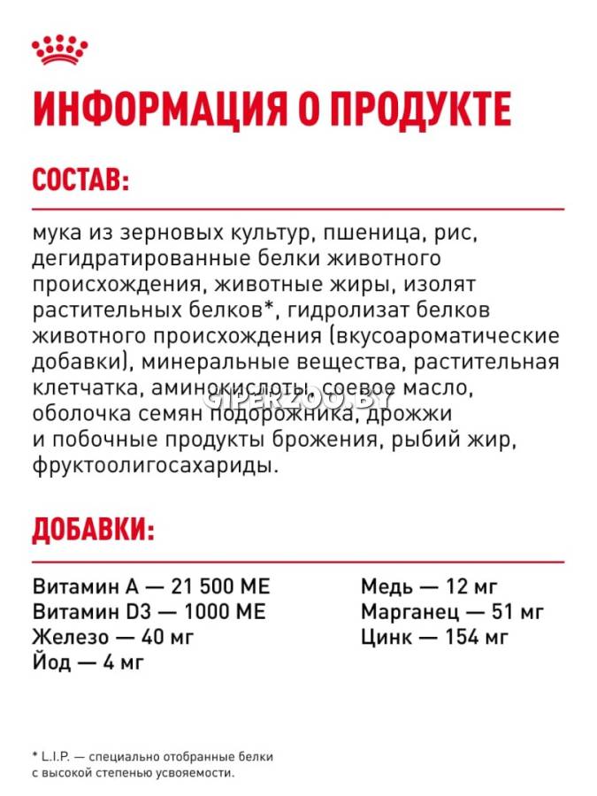 мука из зерновых культур, дегидратированные белки животного происхождения (птица), пшеница, животные жиры, рис, изолят растительных белков*, гидролизат белков животного происхождения (вкусоароматические добавки), растительная клетчатка, минеральные вещества, соевое масло, рыбий жир, оболочка и семена подорожника, дрожжи и побочные продукты брожения, фруктоолигосахариды.