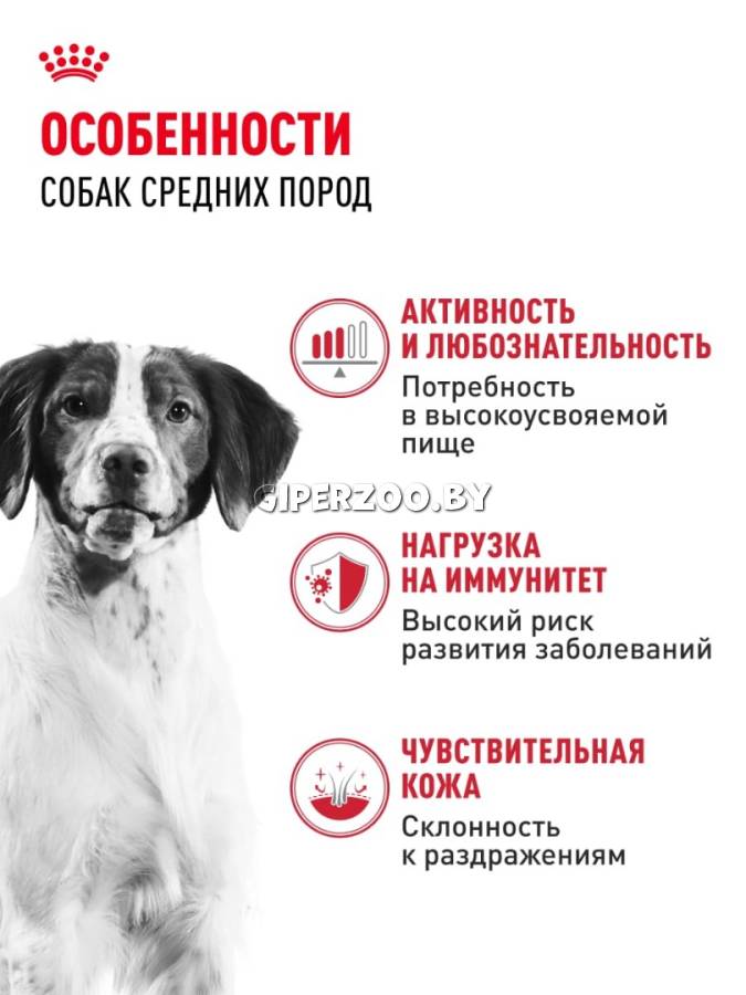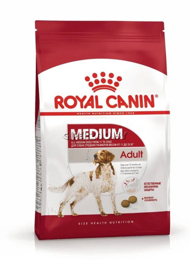 Сухой корм для собак Royal Canin Medium Adult (Роял Канин Медиум эдалт), 4 кг - сухой корм для собак в возрасте 12 месяцев и старше. MEDIUM Adult удовлетворяет особые потребности собак средних размеров (весом от 11 до 25 кг).
