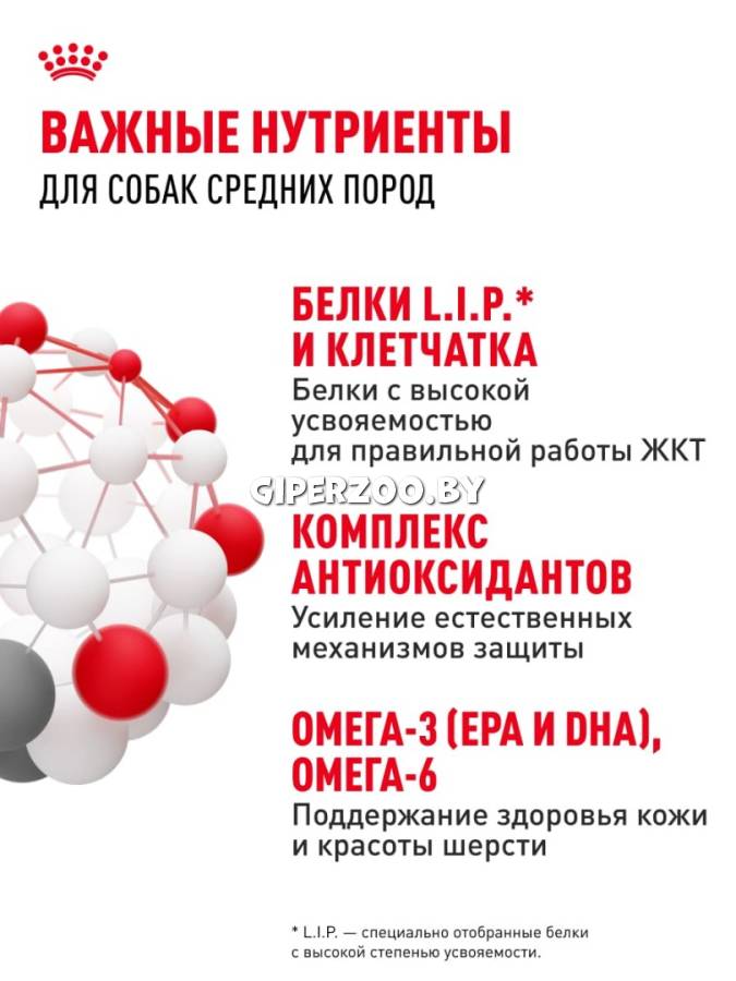 ROYAL CANIN® Medium Adult также обогащен жирными кислотами Омега-3 (ЭПК и ДГК), необходимыми для здоровья кожи и красоты шерсти животного.