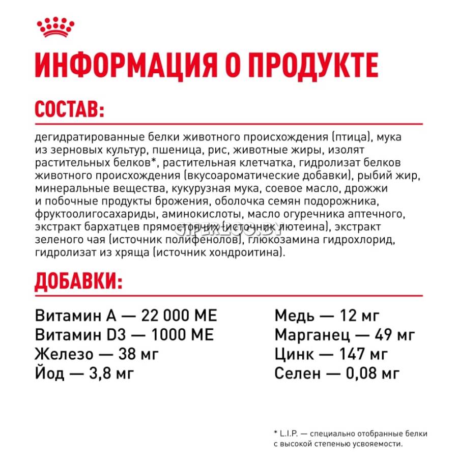 дегидратированные белки животного происхождения (птица), мука из зерновых культур, пшеница, рис, животные жиры, изолят растительных белков*, растительная клетчатка, гидролизат белков животного происхождения (вкусоароматические добавки), рыбий жир, соевое масло, дрожжи и побочные продукты брожения, минеральные вещества, оболочка и семена подорожника, фруктоолигосахариды, масло огуречника аптечного, экстракт зеленого чая (источник полифенолов), экстракт бархатцев прямостоячих (источник лютеина), гидролизат из панциря ракообразных (источник глюкозамина), гидролизат из хряща (источник хондроитина).