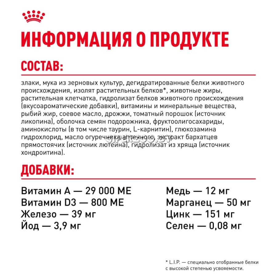 пшеница, дегидратированные белки животного происхождения (птица), рис, изолят растительных белков*, животные жиры, мука из зерновых культур, растительная клетчатка, гидролизат белков животного происхождения (вкусоароматические добавки), рыбий жир, соевое масло, дрожжи и побочные продукты брожения, минеральные вещества, оболочка и семена подорожника, фруктоолигосахариды, гидролизат из панциря ракообразных (источник глюкозамина), масло огуречника аптечного, дегидратированная томатная пульпа (источник ликопена), экстракт зеленого чая (источник полифенолов), экстракт бархатцев прямостоячих (источник лютеина), ликопен, гидролизат из хряща (источник хондроитина).