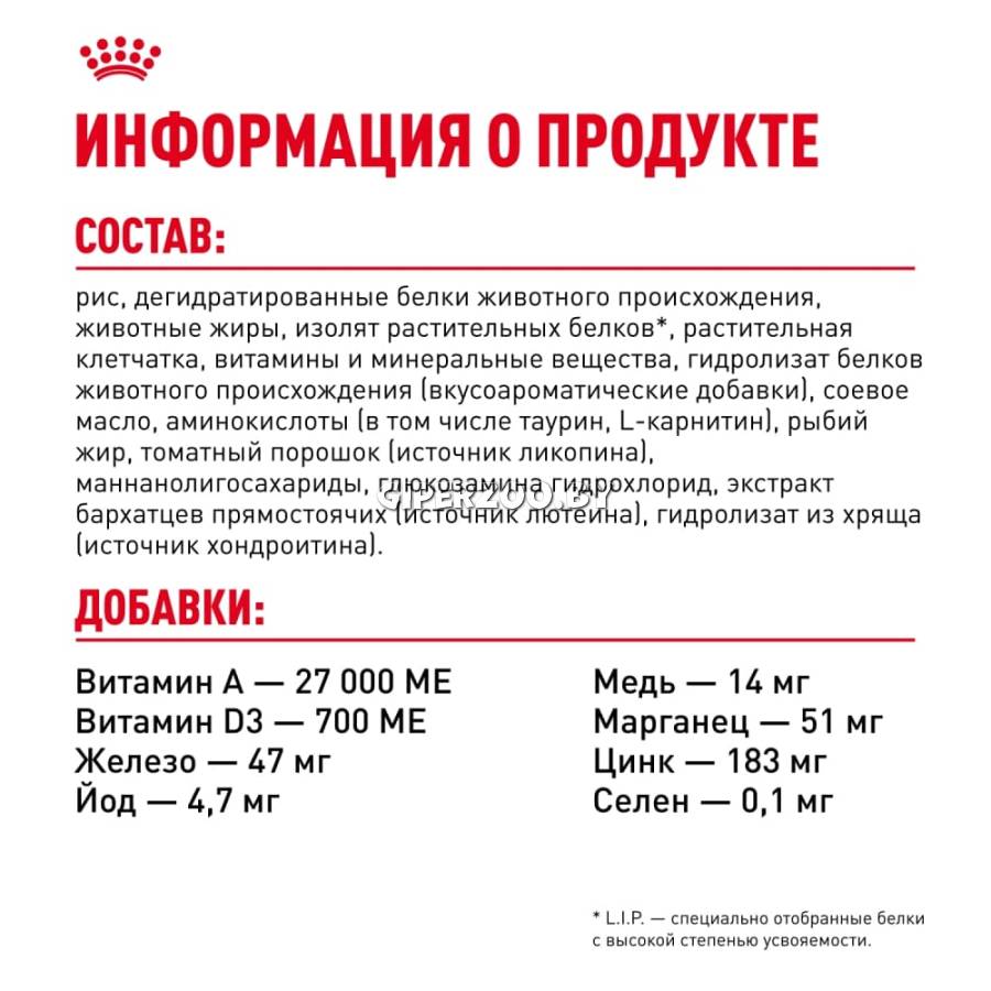 рис, животные жиры, дегидратированные белки животного происхождения (птица), дегидратированные белки животного происхождения (свинина), изолят растительных белков*, гидролизат белков животного происхождения (вкусоароматические добавки), минеральные вещества, рыбий жир, соевое масло, дегидратированные томаты (источник ликопена), гидролизат дрожжей (источник маннановых олиго-сахаридов), гидролизат из панциря ракообразных (источник глюкозамина), экстракт бархатцев прямостоячих (источник лютеина), экстракт зеленого чая (источник полифенолов), гидролизат из хряща (источник хондроитина).