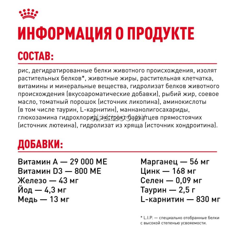 рис, дегидратированные белки животного происхождения (птица), изолят растительных белков*, животные жиры, растительная клетчатка, гидролизат белков животного происхождения (вкусоароматические добавки), минеральные вещества, рыбий жир, соевое масло, томаты (источник ликопена), гидролизат дрожжей (источник мaннановых олигосахаридов), гидролизат из панциря ракообразных (источник глюкозамина), экстракт бархатцев прямостоячих (источник лютеина), экстракт зеленого чая (источник полифенолов), гидролизат из хряща (источник хондроитина).