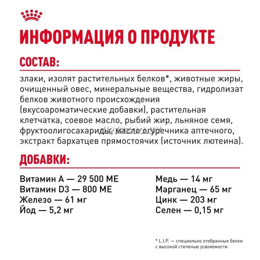 злаки, изолят растительных белков*, животные жиры, очищенный овес, минеральные вещества, гидролизат белков животного происхождения (вкусоароматические добавки), растительная клетчатка, соевое масло, рыбий жир, льняное семя, фруктоолигосахариды, масло огуречника аптечного, экстракт бархатцев прямостоячих (источник лютеина).