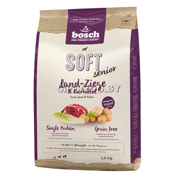 Корм Bosch Soft Senior коза с картофелем - для сбалансированного и здорового питания кастрированных, пожилых собак, и собак с лишним весом всех пород.