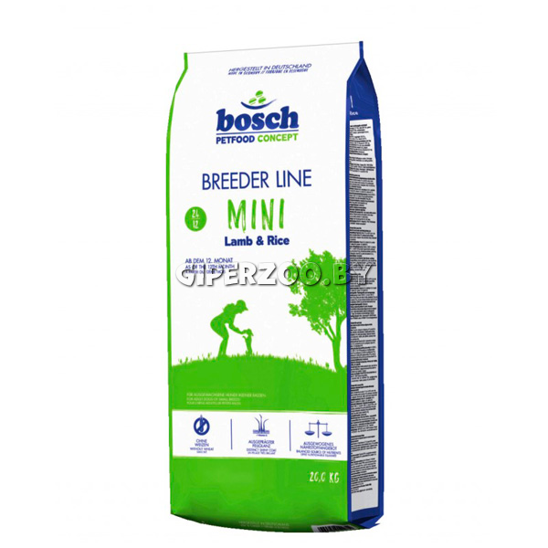 Корм Bosch Breeder Mini LAMB & RICE с ягнёнком и рисом произведён на основе свежего мяса ягнёнка и легко усвояемого риса, что великолепно подходит животным с чувствительным пищеварением.