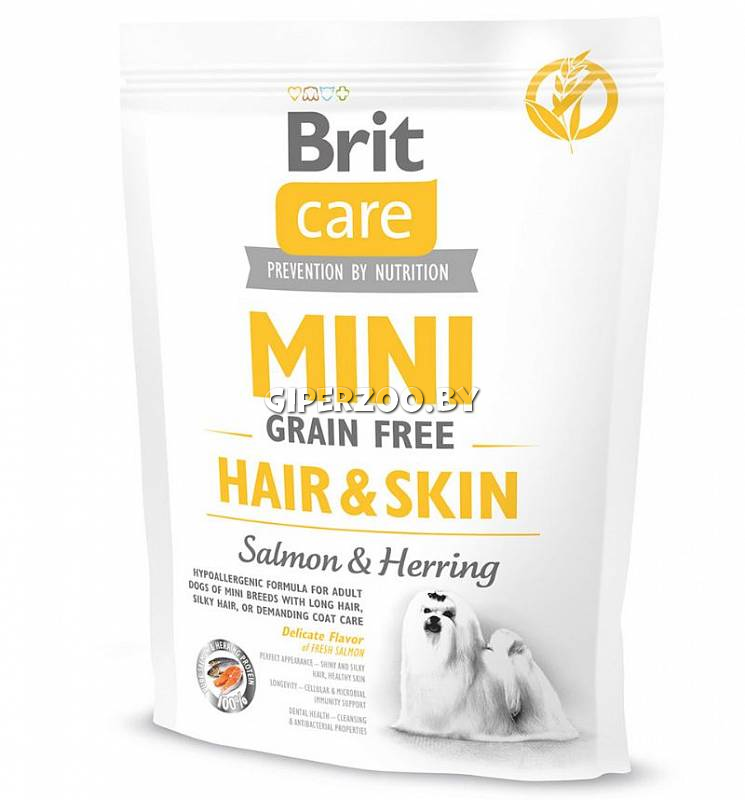 Сухой корм для собак Brit Care Mini GF Hair & Skin (Брит беззерновой Мини, лосось и сельдь), 2 кг - беззерновой гипоаллергенный корм для взрослых собак миниатюрных пород с длинной, шелковистой шерстью, а также для собак, шерсть которых нуждается в дополнительном уходе.