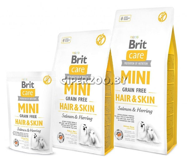 Сухой корм для собак Brit Care Mini GF Hair & Skin (Брит беззерновой Мини, лосось и сельдь), 400 г - беззерновой гипоаллергенный корм для взрослых собак миниатюрных пород с длинной, шелковистой шерстью, а также для собак, шерсть которых нуждается в дополнительном уходе.