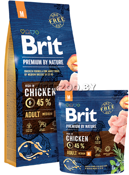 Сухой корм для собак Brit Premium Adult M (Брит Премиум для взрослых собак, курица), 1 кг - это сбалансированный корм для собак средних пород.