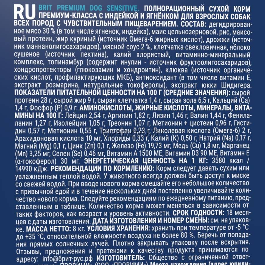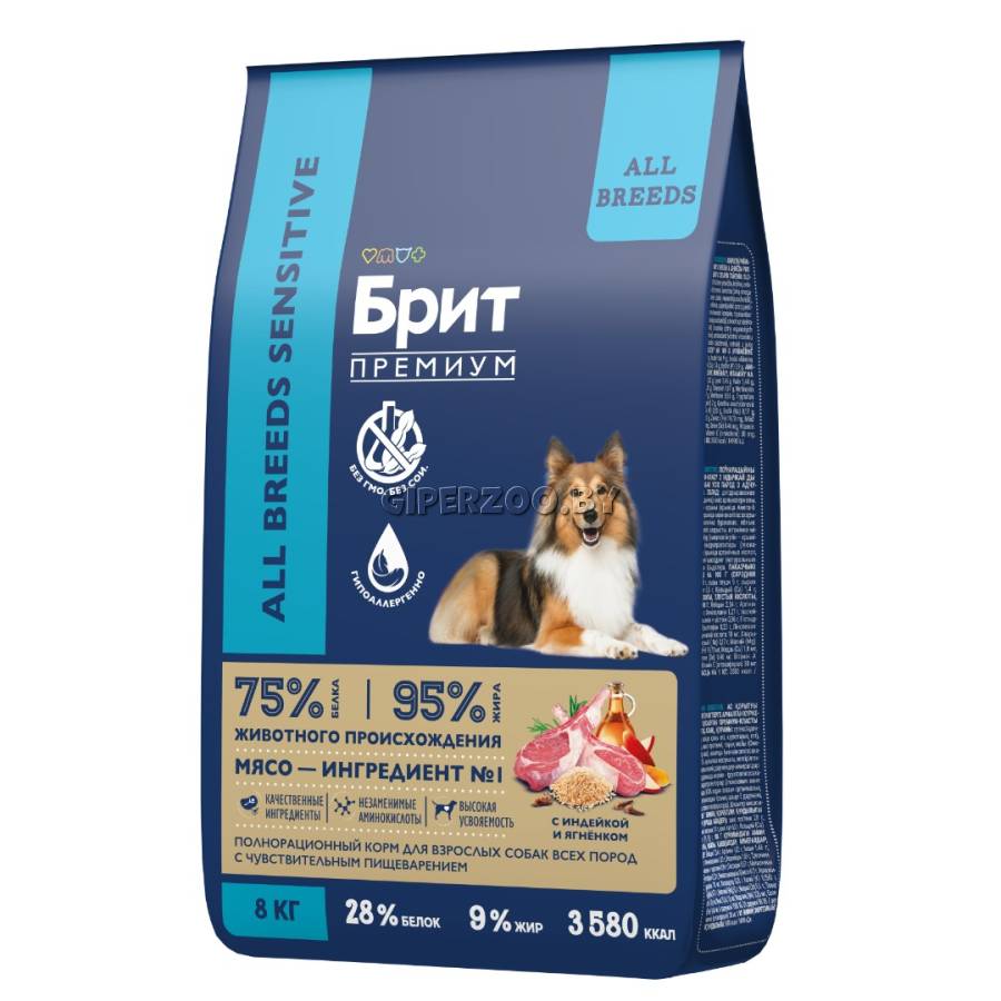Брит Премиум Сухой корм для взрослых собак всех пород с чувствительным пищеварением с ягненком и индейкой Dog Sensitive (Brit Premium) - корм премиум класса с высоким содержанием мяса 30%, в том числе мясо ягненка, индейки.