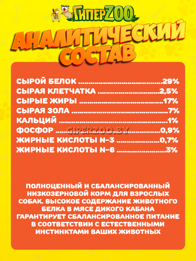 Ингредиенты: дегидрированное мясо дикого кабана (38%), животный жир 17% (сало очищенное на 99,5%), свежее куриное мясо (10%), желтый горох, тапиока, рис (5%),овес (5%), сухая свекольная пульпа, гидролизованный животный белок, минеральные вещества, пивные дрожжи, сухое яйцо (1%), семена льна (1%), дигидрированная морковь (1%), сухая томатная пульпа (1%), волокна гороха, юкка шидигера, спирулина, сухая пульпа ананаса, сухая яблочная пульпа, сухая пульпа черники 0,5% (соответствует 4,3% свежей черники), сухая пульпа клюквы 0,5% (соответствует 4,3% свежей клюквы), сухая пульпа малины 0,5% (соответствует 4,3% свежей малины), ксилоолигосахариды (ХОS 0,3 %), дрожжевые продукты (источник МОS), хондроитина сульфат, глюкозамин, порошок молочного белка.