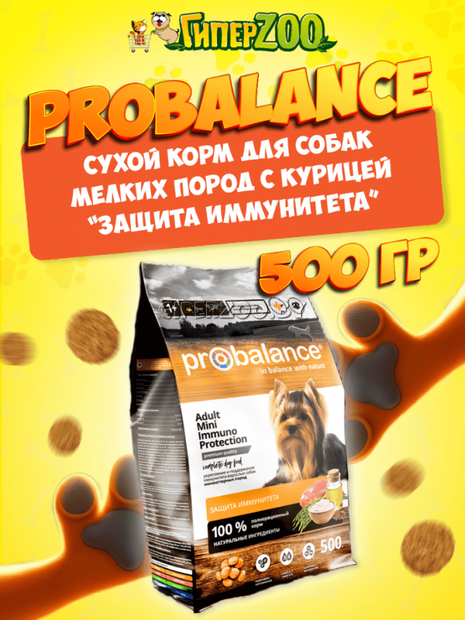 Probalance Immuno Adult Mini, 0,5 кг - полнорационный натуральный сухой корм премиум класса с функцией защиты иммунитета и укрепления организма животного. Корм рекомендован для ежедневного кормления взрослых собак миниатюрных пород. В составе корма нет случайных продуктов. Каждый ингредиент корма тщательно проанализирован, отобран и только затем включен в рецептуру. Все продукты корма сбалансированы и идеально сочетаются друг с другом.