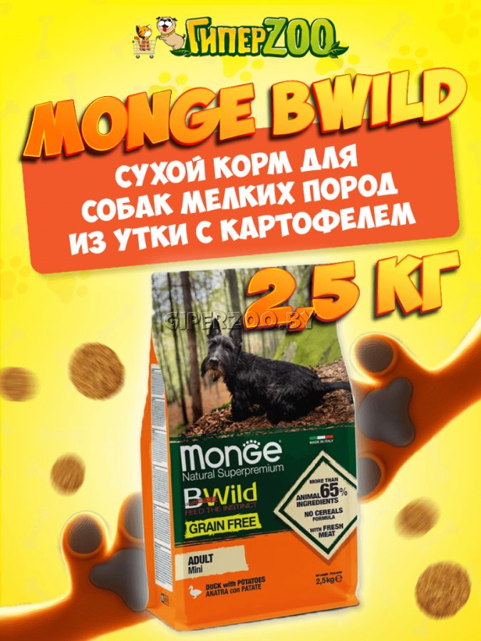 Monge Dog BWild Grain Free Adult Mini (Утка, картофель)2,5 кг - это полноценная сбалансированная диета для собак мелких пород, склонных к аллергической реакции на глютен, а также для молодых животных, ведущих активный образ жизни.