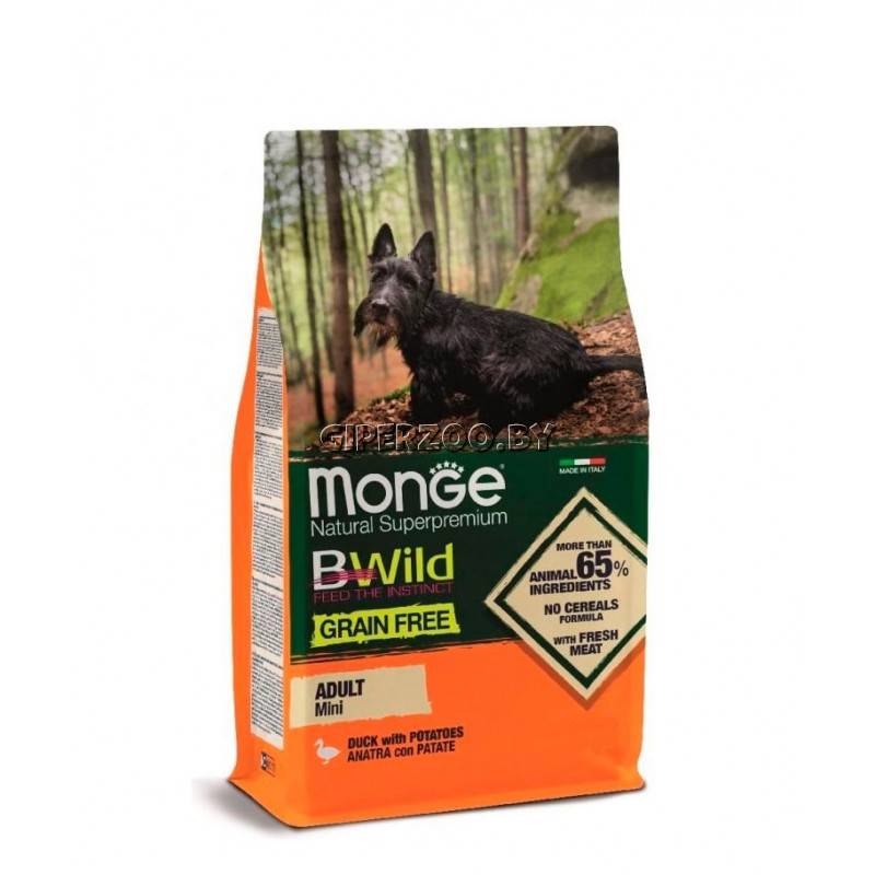 Monge Dog BWild Grain Free Adult Mini (Утка, картофель) 2,5 кг - это полноценная сбалансированная диета для собак мелких пород, склонных к аллергической реакции на глютен, а также для молодых животных, ведущих активный образ жизни.
