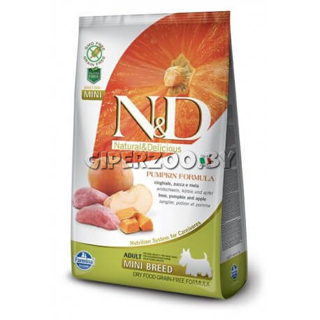 Farmina N&D Grain Free Pumpkin Dog Boar & Apple Adult Mini, 800 гр - полнорационное беззерновое питание для собак мелких пород (кабан, тыква, яблоко).