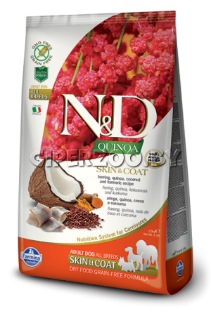 Farmina N&D Dog Grain Free Quinoa Skin & Coat Herring (cельдь, киноа, кокос и куркума), 7 кг - беззерновой корм для взрослых собак, приготовленный на основе нежной сельди, киноа, кокоса и куркумы и других полезных для здоровья ингредиентов. Он заботится о состоянии кожи, делает шерсть густой и блестящей.