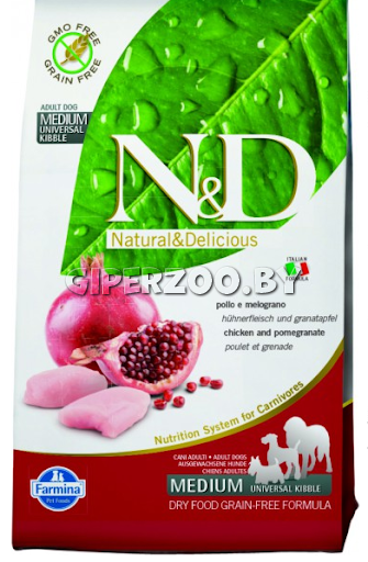 Farmina N&D All Breed Adult (курица и гранат), 12 кг - полнорационный беззерновой корм для взрослых собак всех пород. Курица с гранатом (Курица, гранат, алоэ вера, подорожник, куркума, зеленый чай).