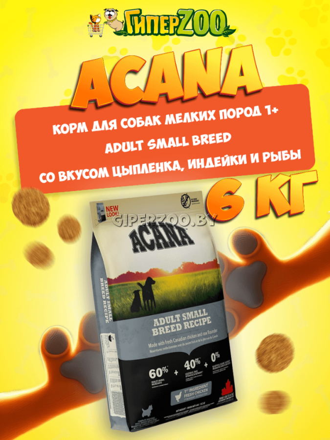 Сухой корм Acana Adult Small Breed (Акана Эдалт Смолл Брид с цыпленком, индейкой и рыбой), 6 кг - корм для взрослых собак мелких пород старше 1 года.