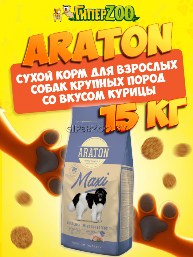 Araton Adult Maxi (Аратон Эдалт Макси), курица, 15 кг - сухой повседневный корм с глюкозамином и хондроитином для взрослых собак крупных пород. Вес взрослой собаки 25 – 80 кг