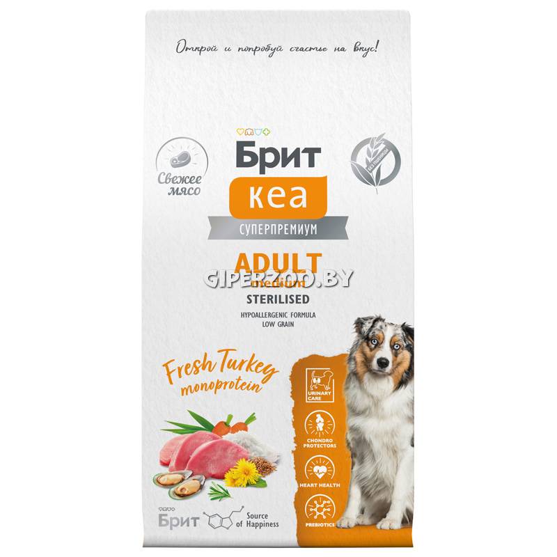 Брит Кеа Сухой корм для стерилизованных собак средних пород (индейка) - полнорационный сухой корм суперпремиум-класса с индейкой для взрослых стерилизованных собак средних пород (10-25 кг). Монопротеин. Стерилизованные собаки склонны к появлению мочекаменной болезни. Потому важно регулировать pH-баланс выделительной системы. Также после стерилизации питомцы могут набирать вес из-за снижения активности. Это приводит к болезням сердца, печени и почек. Корм Sterilised помогает предотвратить данные последствия для организма.