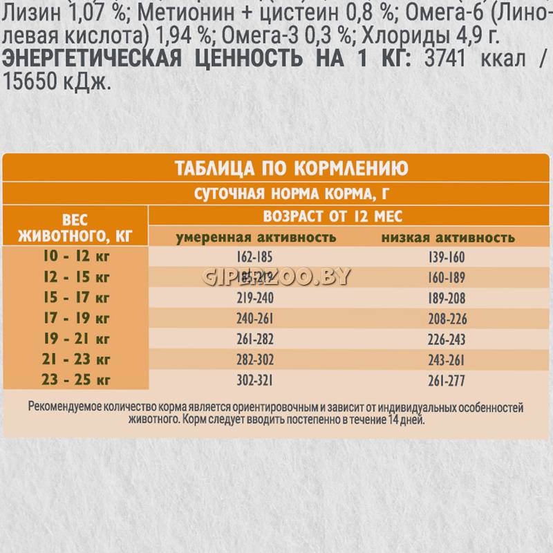 Аналитический состав: сырой белок 25 %, сырой жир 14 %, сырая клетчатка 3 %, сырая зола 7,1 %, влажность 8 %, Кальций (Са) 1,2 %, Фосфор (Р) 0,9 %, соотношение Кальций (Са) / Фосфор (Р) 1,3:1, Натрий (Na) 0,2 %, Магний (Mg) 0,1 %.