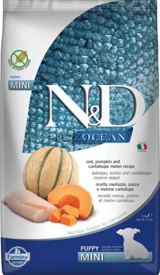 Фармина Корм НД ОУШЕН ДОГ Cod, Pumpkin & Cantaloupe Melon PUPPY MINI 7 kg / треска, тыква и дыня д/ щенков мелких пород.