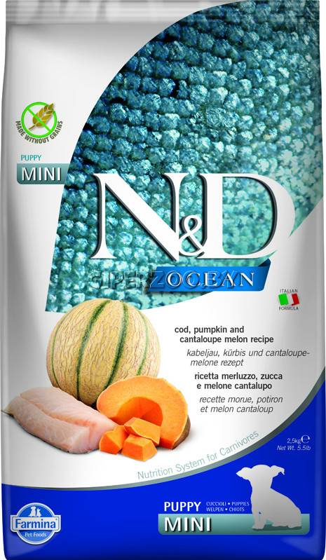 N&D Ocean Dog Pumpkin Codfish & Cantaloupe Melon Puppy MINI - полнорационный корм для щенков и беременных и кормящих собак мелких пород (треска, тыква и дыня).