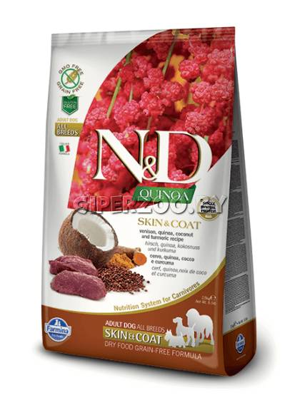 Farmina N&D Grain Free Quinoa Dog Skin & Coat Venison Adult - беззерновой корм на киноа для здоровья кожи и шерсти взрослых собак (оленина, кокос и куркума). ИНГРЕДИЕНТЫ: Свежая оленина без костей (18%), дегидратированная оленина (18%), гороховый крахмал, рыбий жир, экстракт семян киноа (8%), льняное семя, сушеный кокос (2,5%), куркума (2,5%), инулин, фруктоолигосахариды, маннанолигосахариды (дрожжевой экстракт), карбонат кальция, дикальций фосфат, подорожник, калия хлорид, натрия хлорид, сухие пивные дрожжи, глюкозамин, хондроитин сульфат, экстракт календулы (источник лютеина).