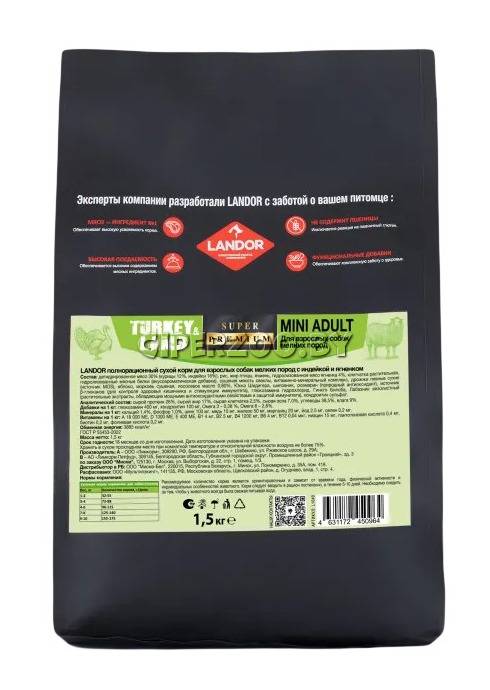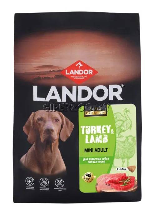 Landor Mini Adult dog (индейка, ягненок), 1,5 кг – полнорационный сухой корм Landor Mini Adult для взрослых собак маленьких пород с индейкой и ягненком. Корм подойдет для животных с чувствительным пищеварением.