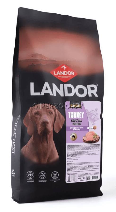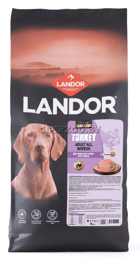 Landor Monoprotein Adult dog (индейка), 15 кг – полнорационный сухой корм для взрослых собак всех пород с индейкой.