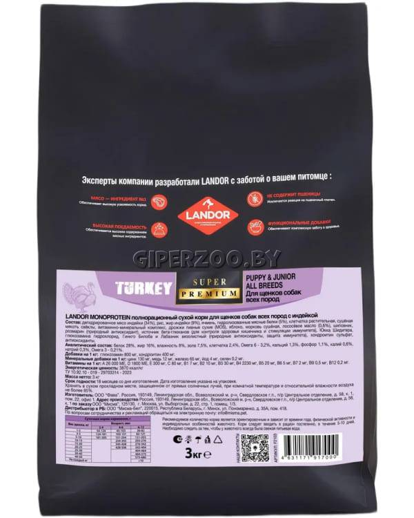 Landor Monoprotein Puppy & Junior dog (индейка), 3 кг – полнорационный сбалансированный гипоаллергенный корм для щенков всех пород. Монобелковый состав.