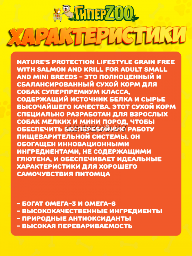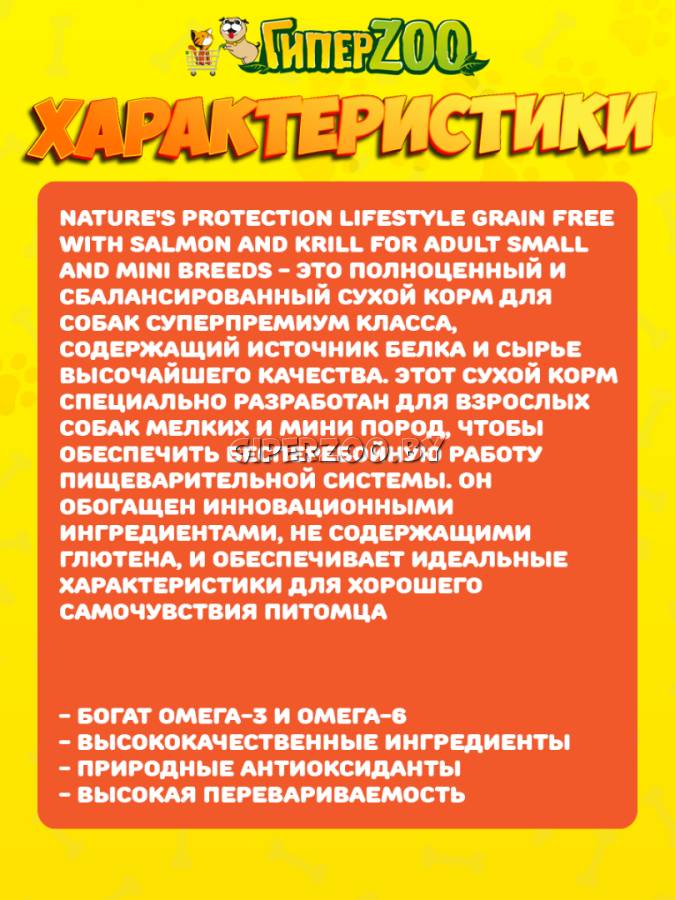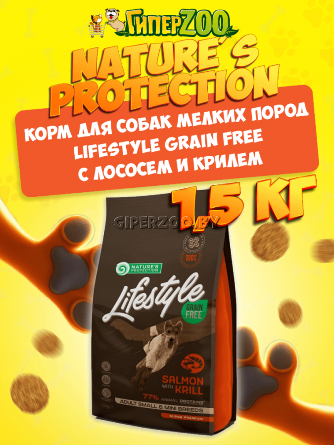 Nature's Protection Lifestyle Grain Free Salmon with krill (Натур Протекшн Лайфстайл с лососем и крилем), 1,5 кг - полнорационный беззерновой корм для взрослых собак маленьких и очень маленьких пород (1–10 кг) с лососем и крилем.