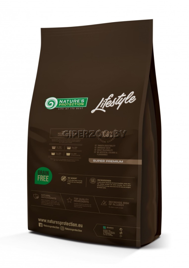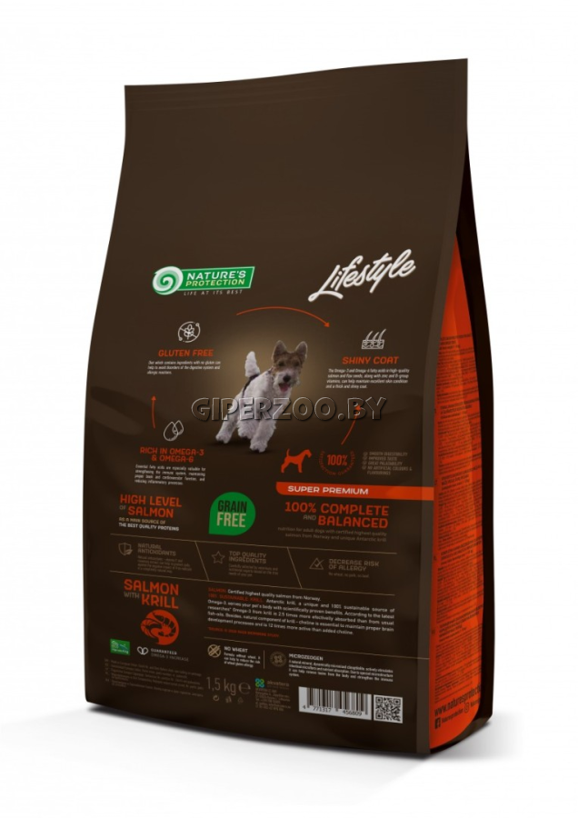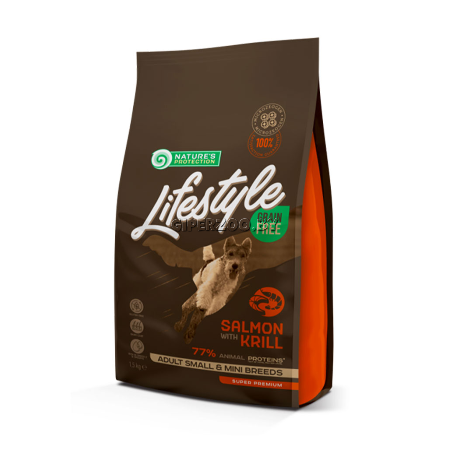 Nature's Protection Lifestyle Grain Free Salmon with krill (Натур Протекшн Лайфстайл с лососем и крилем), 1,5 кг - полнорационный беззерновой корм для взрослых собак маленьких и очень маленьких пород (1–10 кг) с лососем и крилем.
