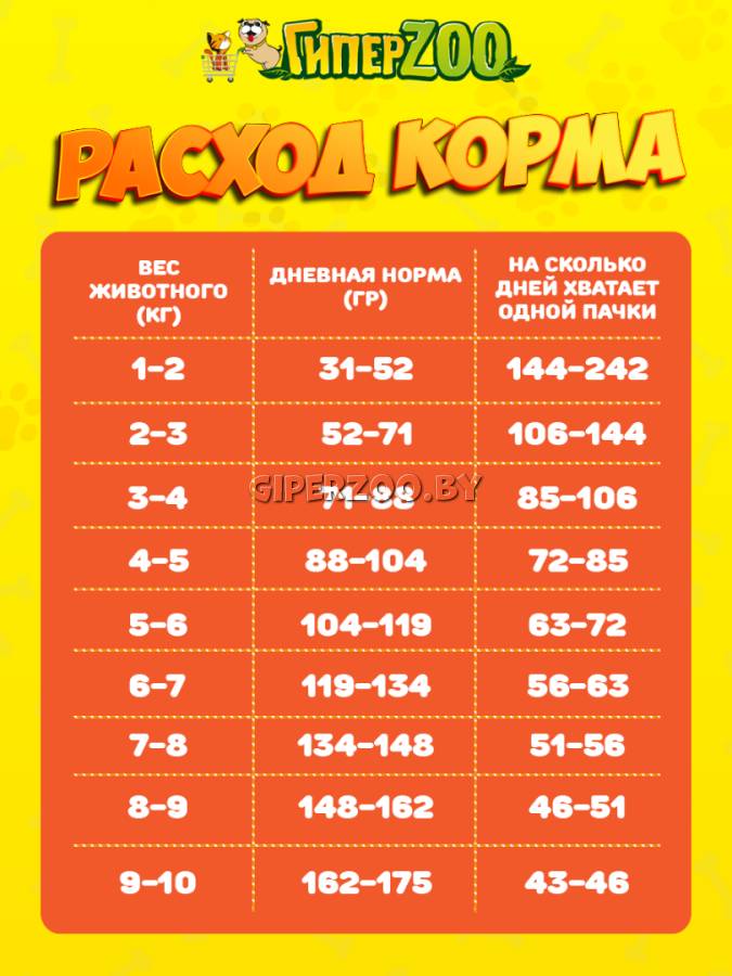 Aнaлитический сырой белок – 24%, необработанные масла и жиры – 13%, сырая зола – 7%, сырая клетчатка – 2,5%, кальций – 1,2%, фосфор – 1%, калий – 0,5%, натрий – 0,4%, омега-3 жирные кислоты – 0,35%, омега-6 жирные кислоты – 2,65%.