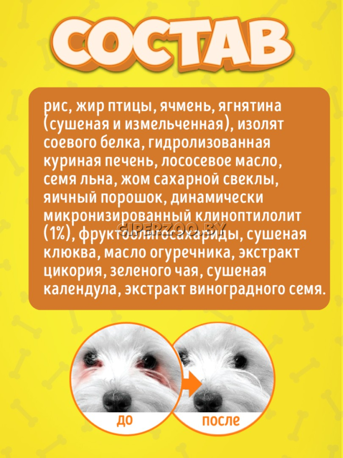 - Разработан по специальной формуле для оптимального решения по кормлению собак белого окраса.